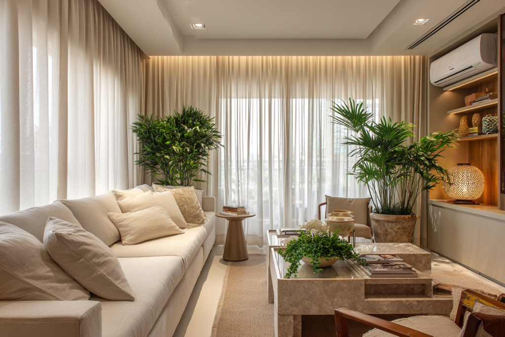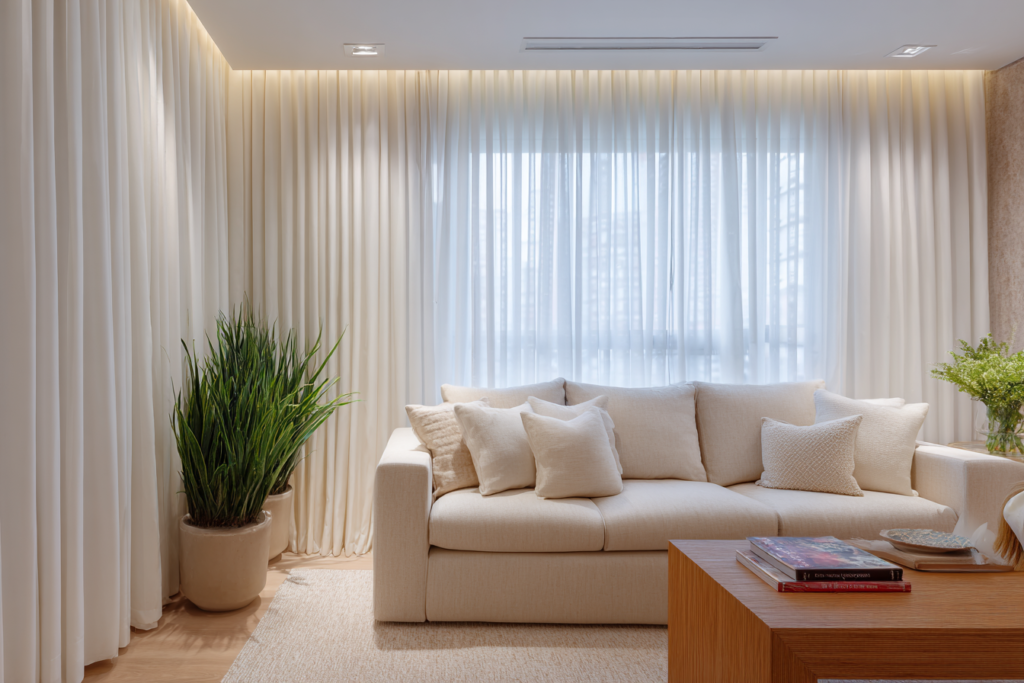Para espaços clássicos, tons claros e tecidos com caimento mais estruturado ajudam a manter sofisticação. Já em apartamentos pequenos, cortinas claras e discretas evitam excesso visual.