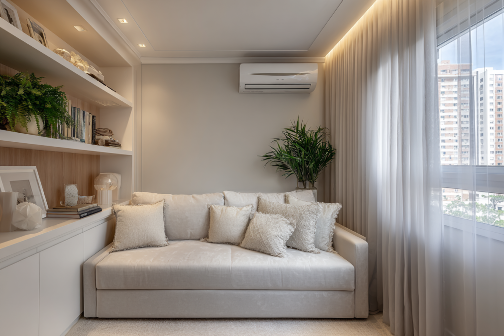 Em apartamentos pequenos, colocar cortina sem furar a parede pode ser uma solução inteligente para manter flexibilidade. Você pode trocar a cortina conforme a estação, mudar o layout ou adaptar a privacidade sem obra.