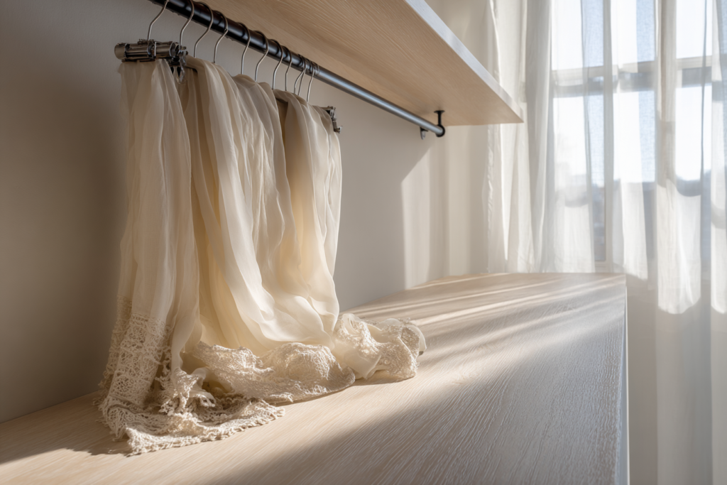 Esse tipo de solução funciona especialmente bem em cortinas leves, painéis decorativos e tecidos de caimento suave.