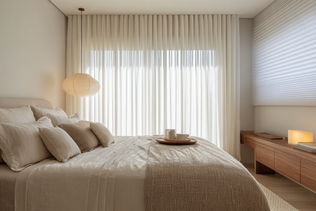 No quarto, a cortina precisa equilibrar estética, privacidade e controle de luz. Se a intenção for apenas suavizar a luminosidade, cortinas leves funcionam bem com sistemas sem furo.