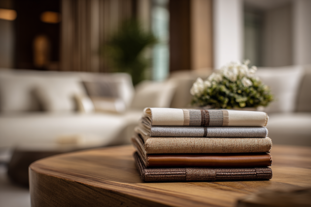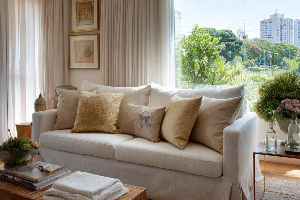 Para quem tem crianças, pets ou rotina movimentada, tecidos mais escuros, estampas discretas e capas removíveis são escolhas inteligentes. A decoração continua bonita, mas a manutenção fica mais realista.