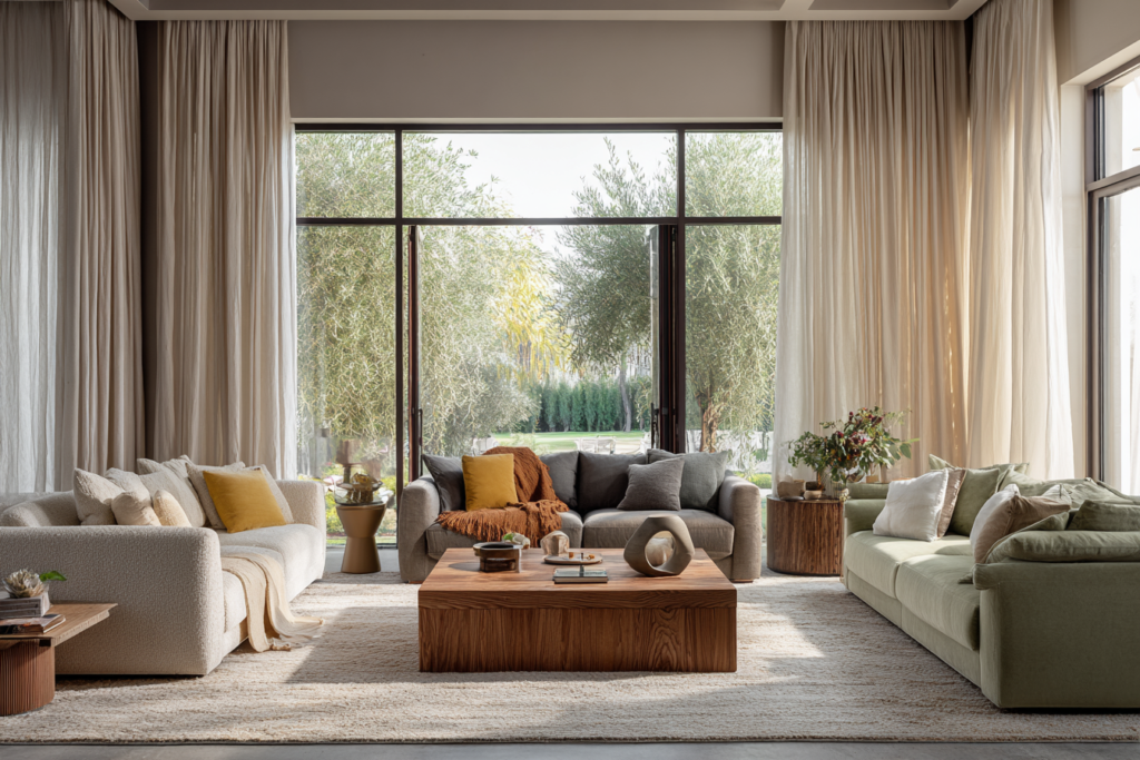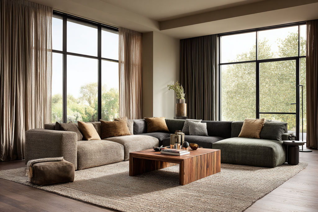 Muitas vezes, a solução mais inteligente está no meio. Nem muito claro, nem muito escuro. Sofás em greige, areia, cinza médio quente, caramelo ou verde acinzentado entregam personalidade sem limitar tanto a decoração.