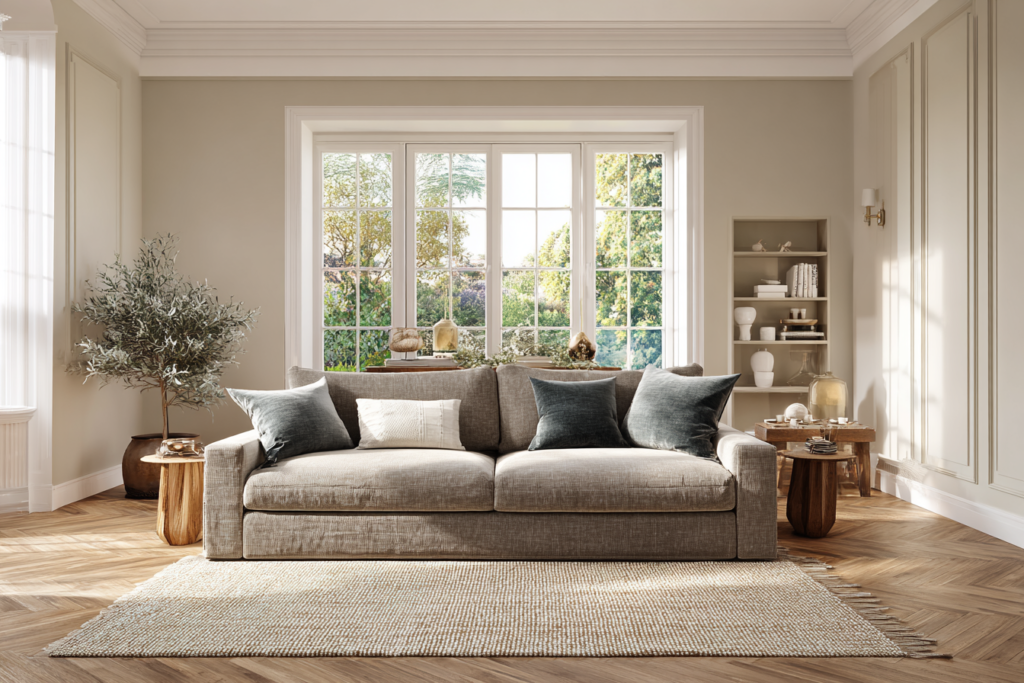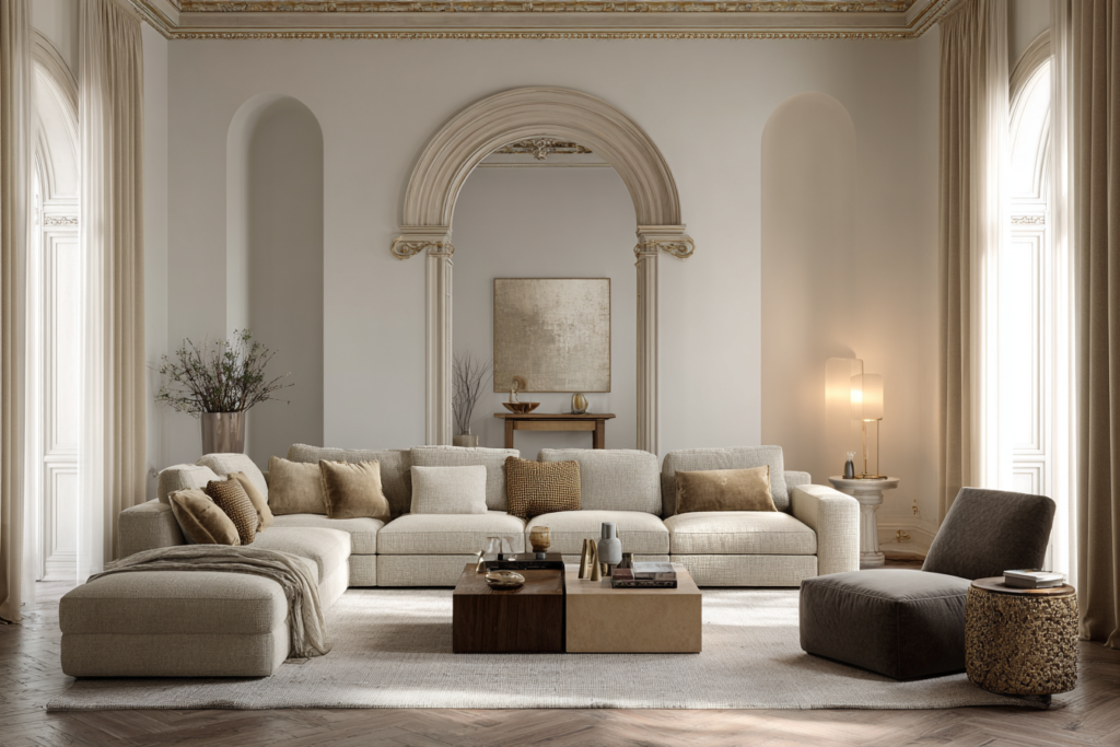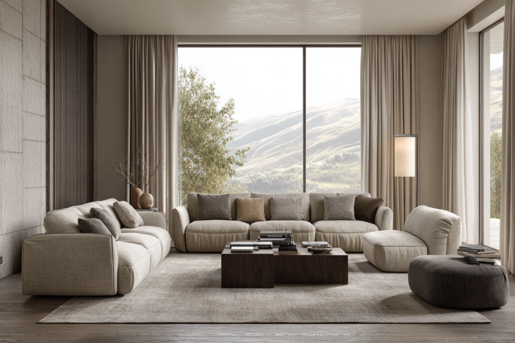 Quanto mais neutra a cor, maior a versatilidade. Sofás em bege, cinza, marrom, fendi e off-white costumam se adaptar bem a diferentes estilos decorativos. Isso não significa que sejam sem graça. Significa que funcionam como base.