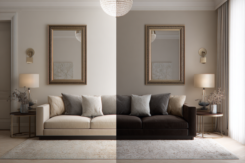Em ambientes compactos, o sofá não deve ser analisado isoladamente. Um sofá marrom médio pode funcionar bem se o tapete for claro, a cortina for leve e a parede ajudar a iluminar. Da mesma forma, um sofá bege pode não resolver nada se o restante da sala estiver carregado.