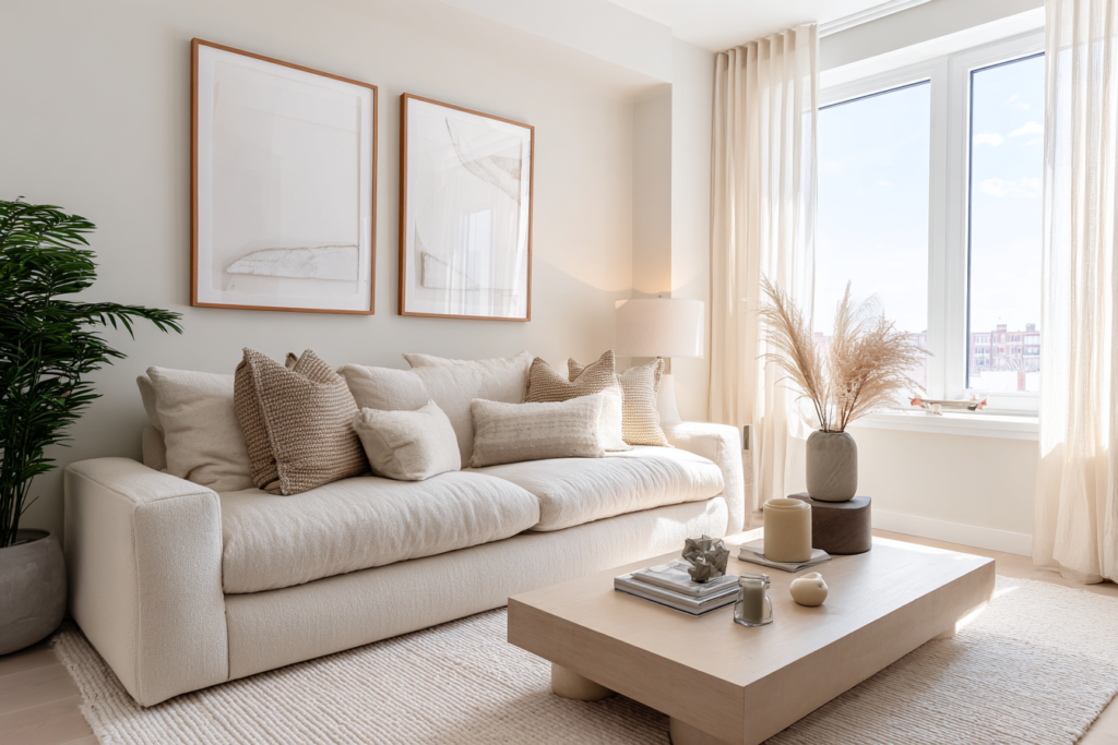 Quando sofá, tapete, parede e cortina têm tons muito parecidos, a sala pode ficar sem profundidade. Mesmo em paletas neutras, é importante variar intensidade, textura e temperatura de cor.