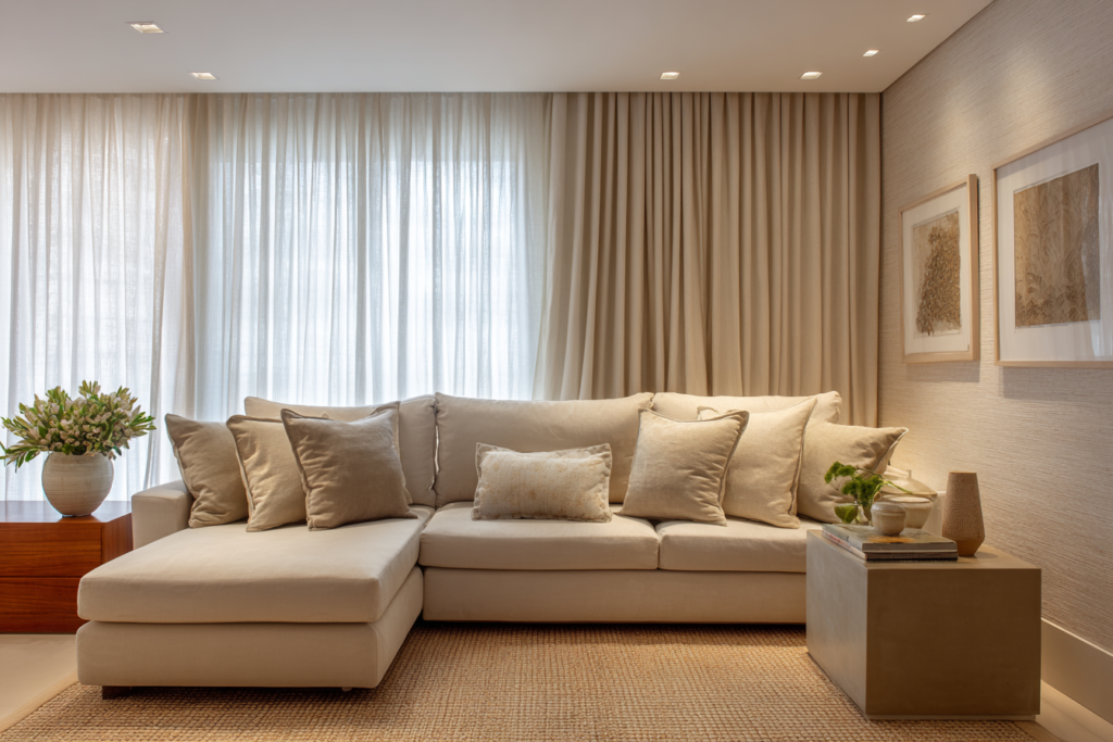 A cortina ajuda a regular a sensação geral do ambiente. Em salas com sofá escuro, cortinas leves e claras costumam equilibrar. Em salas com sofá claro, cortinas em linho natural, bege ou cinza suave podem reforçar a sofisticação.