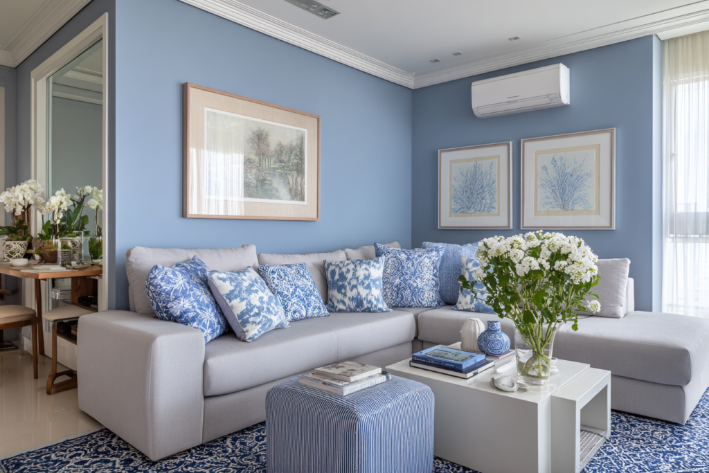 O cinza é versátil, mas precisa ser bem escolhido. Um cinza quente ou levemente acastanhado costuma funcionar melhor em casas reais do que um cinza frio demais. Ele é ótimo para salas contemporâneas, urbanas e mais minimalistas.
