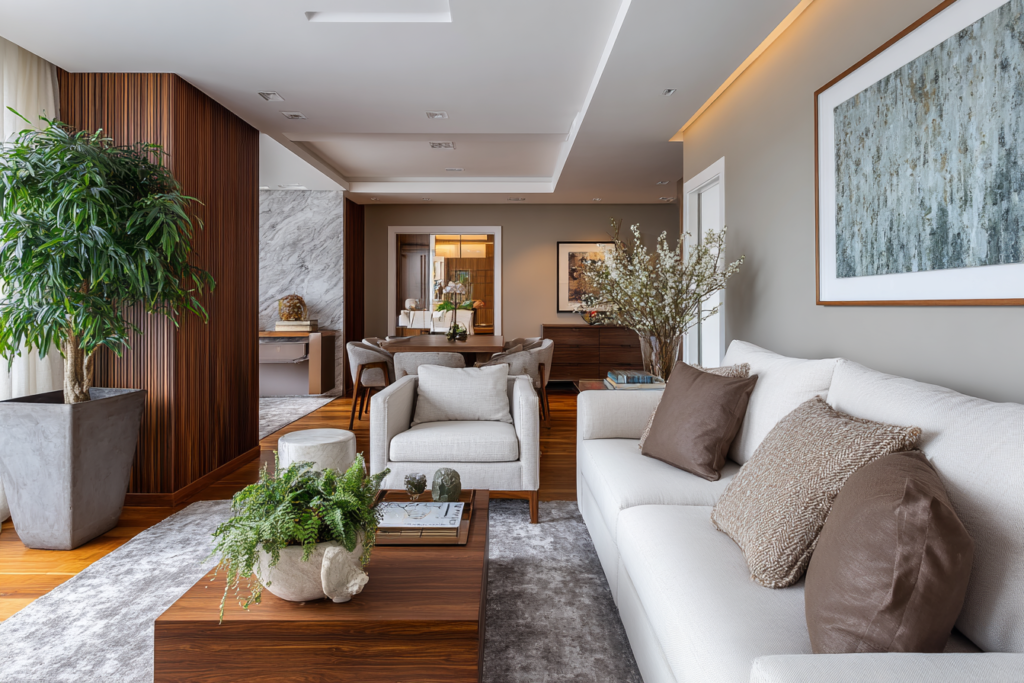 Um sofá cinza frio, por exemplo, costuma ganhar equilíbrio quando aparece ao lado de um tapete em bege quente ou fendi. A sala fica menos “gelada” e mais acolhedora.