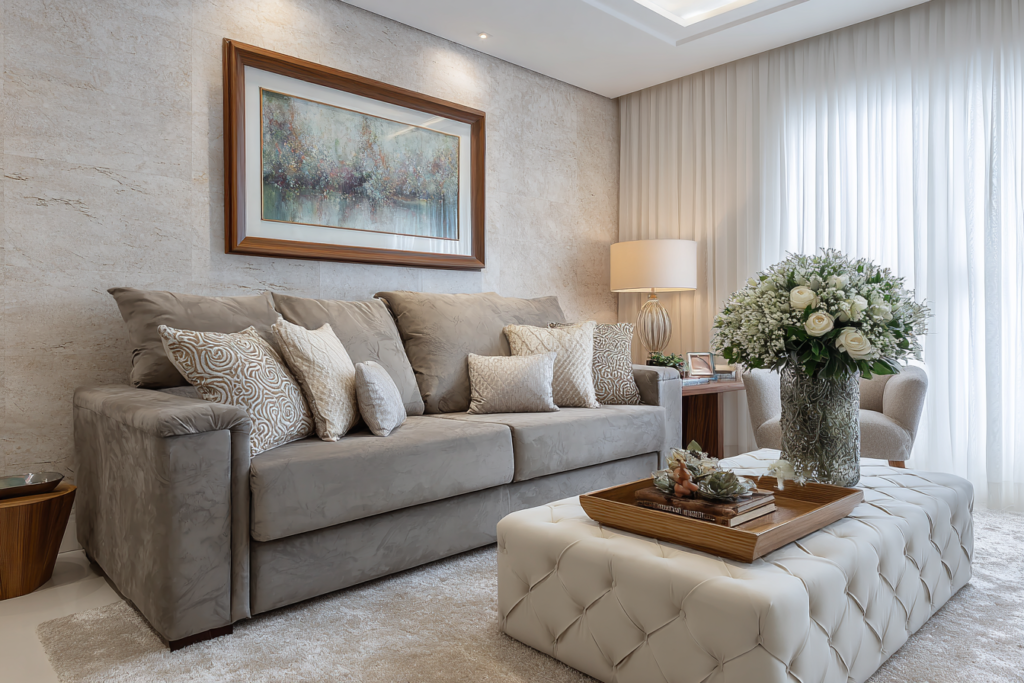 Por fim, observe o estilo do espaço. Uma sala contemporânea tende a aceitar bem neutros limpos, cinzas sobre cinzas e contrastes pontuais. Já uma proposta mais acolhedora pode funcionar melhor com bege, areia, caramelo, terracota ou estampas suaves.