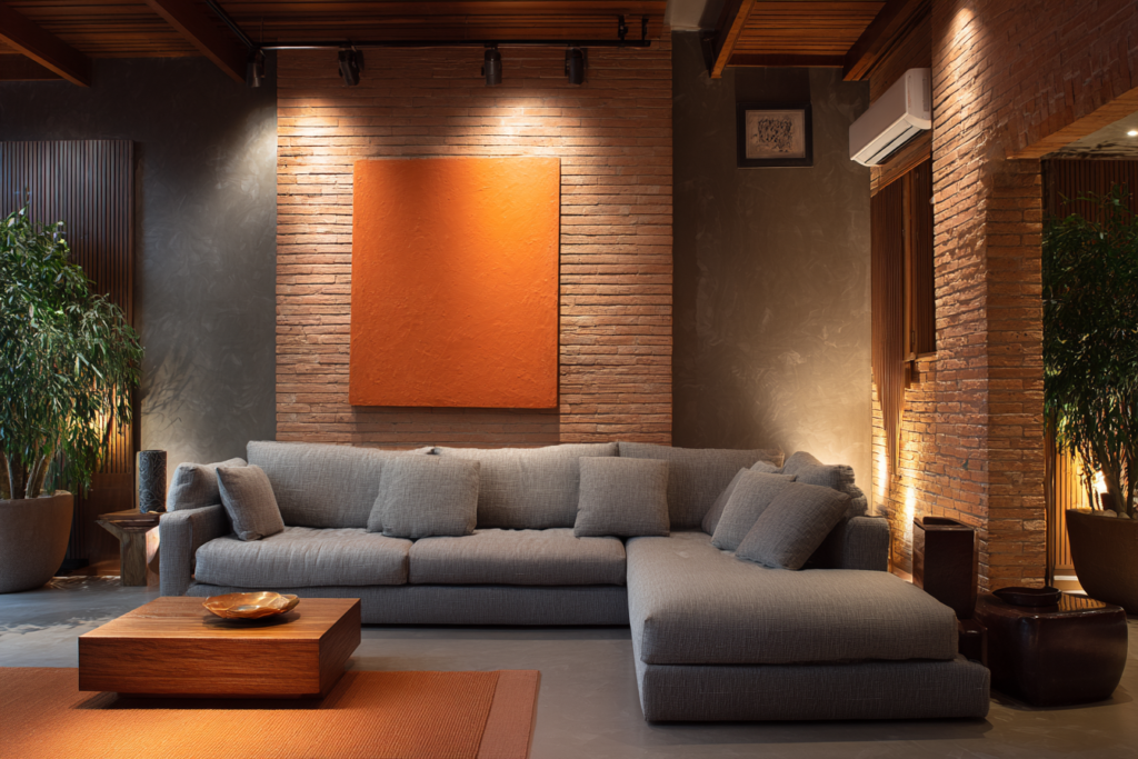A primeira variável é o tom do cinza. Um sofá cinza claro aceita tanto contrastes suaves quanto composições mais marcantes. Já um sofá cinza escuro costuma pedir mais atenção à luminosidade do ambiente, porque algumas combinações podem deixar a sala densa demais.