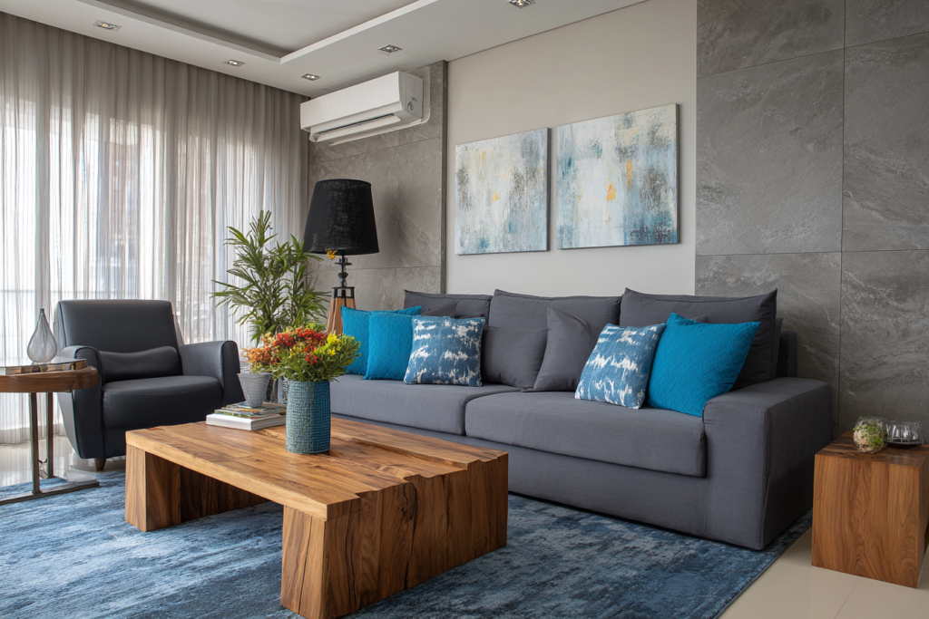 O azul é uma das combinações mais seguras com sofá cinza. Tons acinzentados, azul petróleo, azul profundo e azul lavado costumam funcionar muito bem porque mantêm sofisticação e ainda adicionam personalidade.