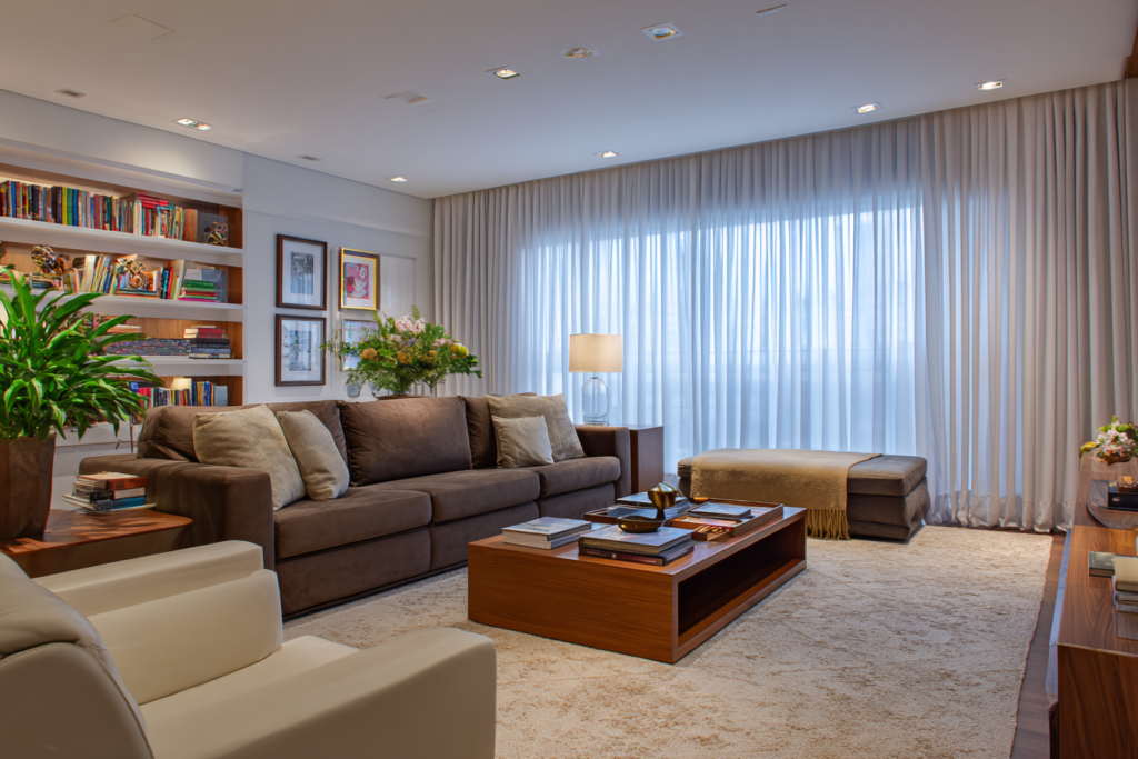 Em uma sala com sofá marrom, o tapete tem três funções principais. A primeira é equilibrar a intensidade do sofá. A segunda é criar unidade com os demais elementos, como cortina, mesa de centro, almofadas e parede. A terceira é ajudar a definir o estilo do ambiente, seja ele contemporâneo, clássico, natural ou acolhedor.