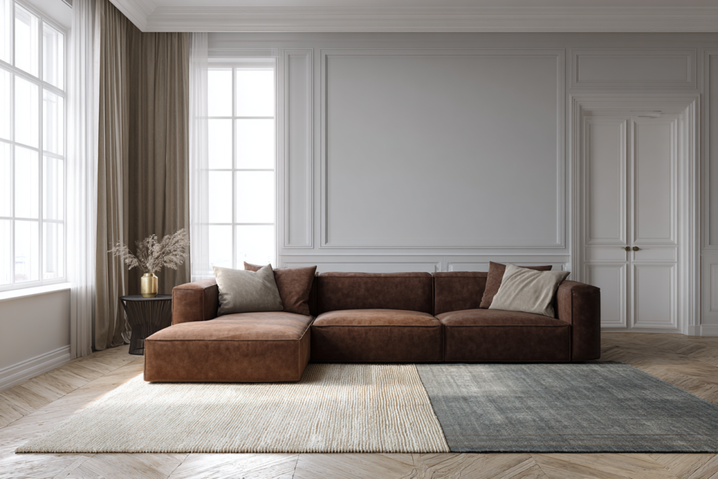Por que o tapete muda completamente a leitura de um sofá marrom