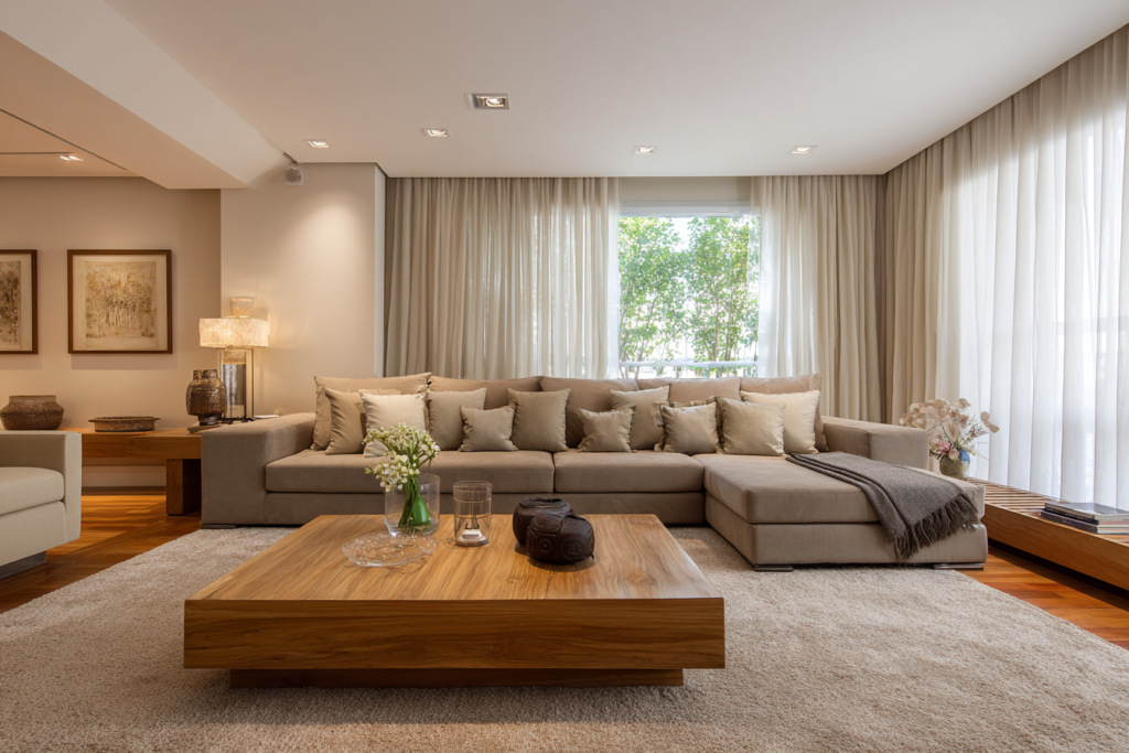 Sofá marrom com tapete fendi ou bege com desenho discreto, mesa lateral mais refinada, cortinas encorpadas e almofadas em creme e caramelo. O conjunto ganha profundidade sem perder sobriedade.