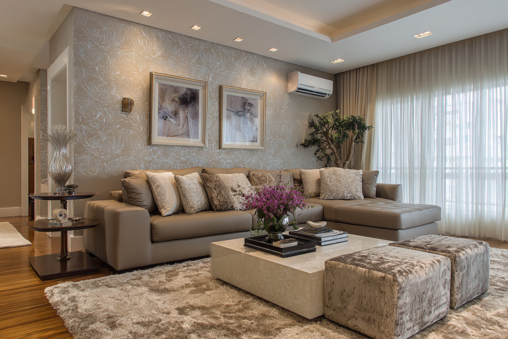 Normalmente, um tapete em bege, cru, areia ou greige claro funciona melhor. Ele amplia visualmente o espaço e cria um contraste equilibrado com o sofá.