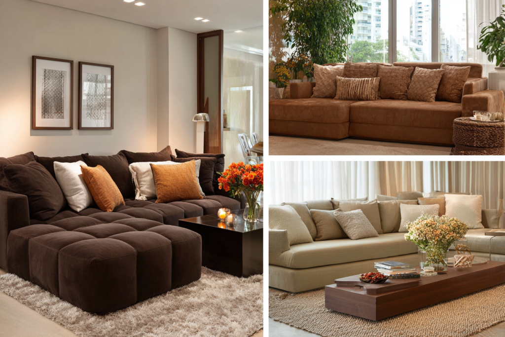 Antes de definir a cor do tapete, vale observar o tom do sofá. Esse ponto costuma ser ignorado, e é justamente aí que muitos erros acontecem. Nem todo marrom pede a mesma solução.