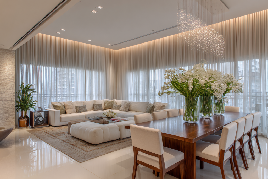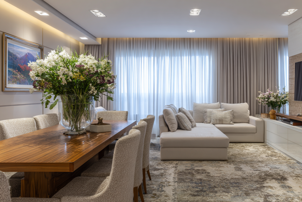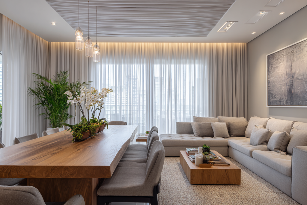 Em ambientes integrados, como sala de estar e jantar no mesmo eixo visual, a cortina precisa conversar com a arquitetura inteira, não só com um canto específico.