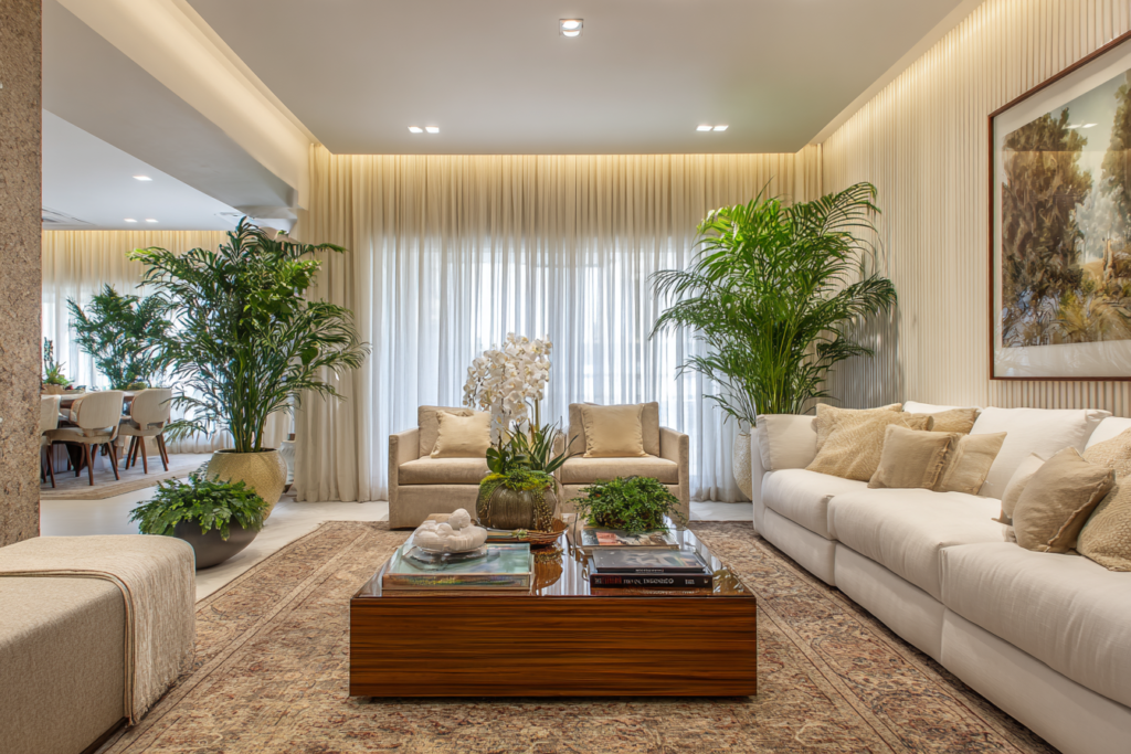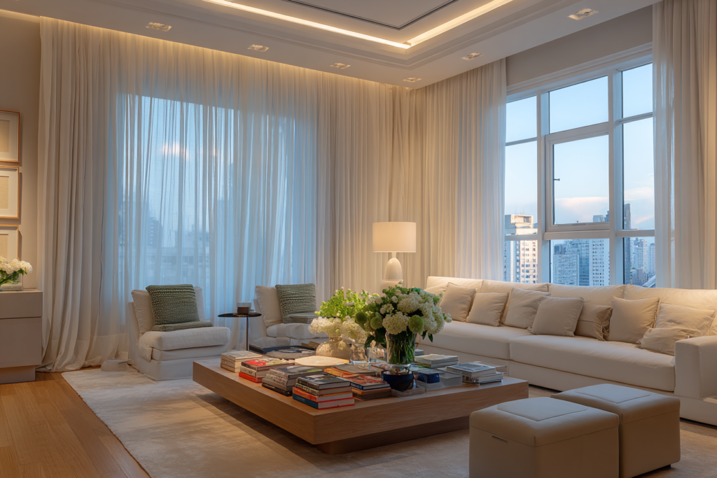 Na sala ampla, há mais liberdade para trabalhar presença. A cortina pode ter mais volume, tecido mais encorpado e, em alguns casos, até composição em dupla camada.